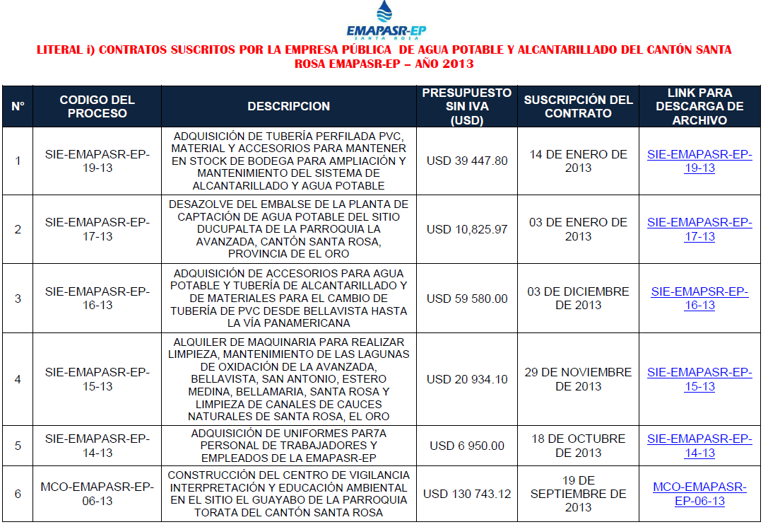 La EMAPASR-EP en cumplimiento con el Art. 7 literal i) de la LOTAIP, pone a disposición de la ciudadanía el listado de contratos suscritos del año 2013 incluídos los procesos ordinarios.