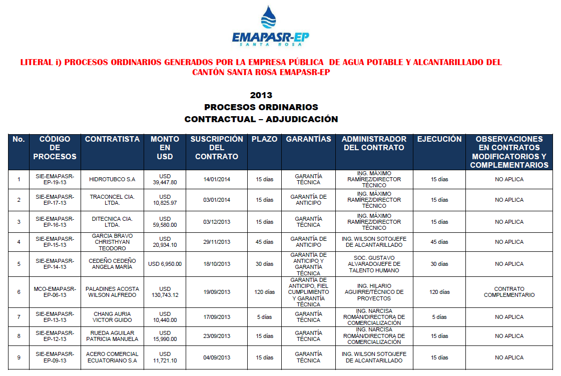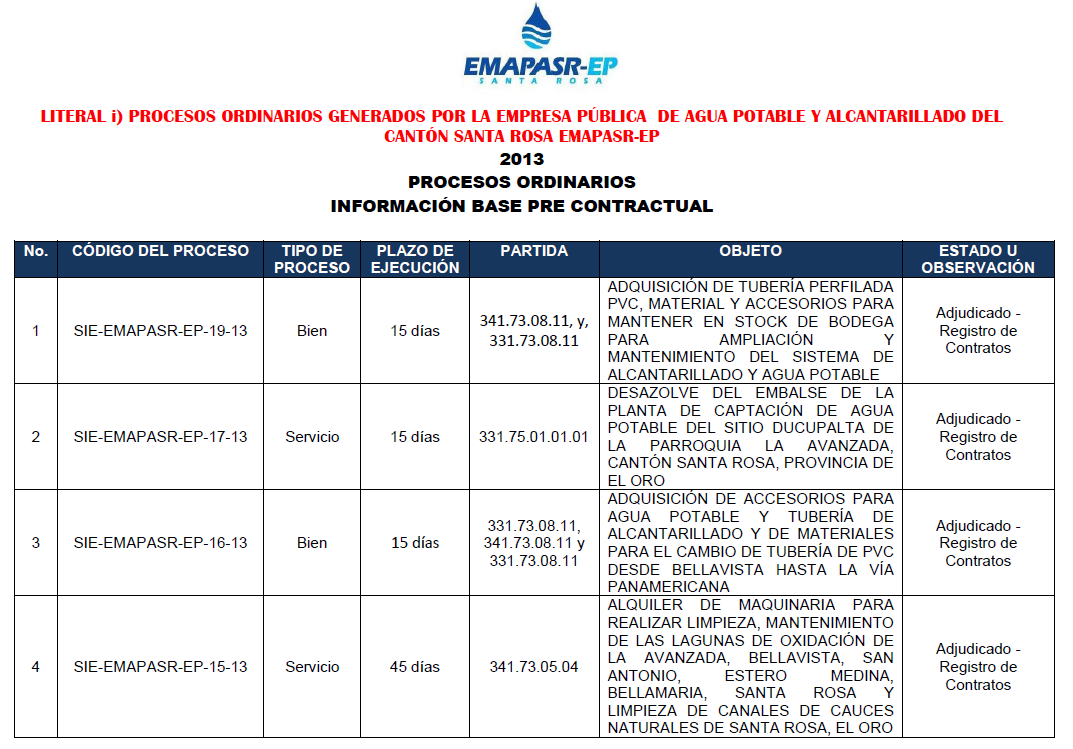 En la información de los procesos ordinarios se detalla las etapas pre-contractuales y contractuales del periodo 2013.