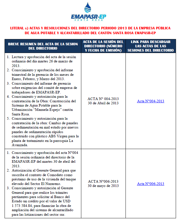 Las actas sesionadas por el directorio de EMAPASR-EP en el 2013 puede descargarlos a continuación.