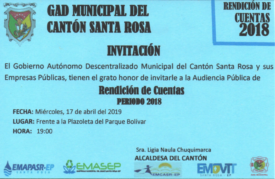 EMAPASR, pone a disposición de la ciudadanía el Informe de Rendición de Cuentas 2018, en el cual se detalla las acciones realizadas y resultados obtenidos en el transcurso del año 2018, con el fin de que la ciudadanía nos haga llegar sus comentarios y sugerencias, de acuerdo a lo que estipula la Ley de Participación Ciudadana y Control Social.