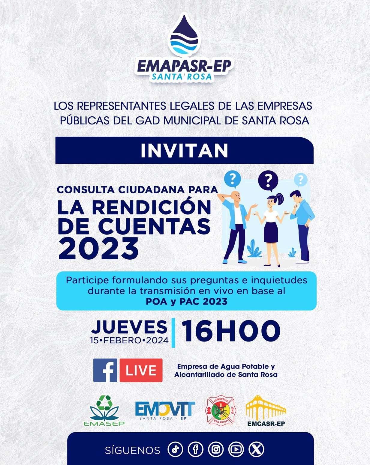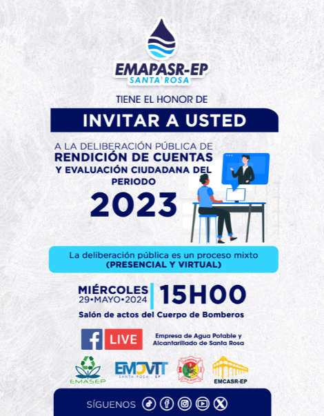 EMAPASR, pone a disposición de la ciudadanía el Informe de Rendición de Cuentas 2023, en el cual se detalla las acciones realizadas y resultados obtenidos en el transcurso del año 2023, con el fin de que la ciudadanía nos haga llegar sus comentarios y sugerencias, de acuerdo a lo que estipula la Ley de Participación Ciudadana y Control Social.