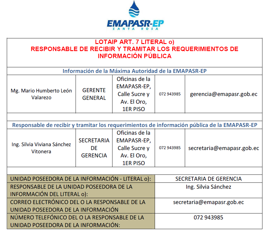 La EMAPASR-EP en cumplimiento con el Art. 7 de la Ley Orgánica de Transparencia y Acceso a la Información, la ciudadanía en general puede solicitar esta informacón a traveés de la responsable.